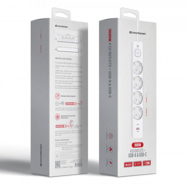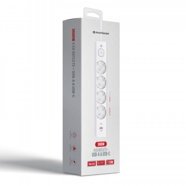 Сетевой фильтр-удлинитель ArmorStandart A-PS42 1.8m 4 розетки + USB-A + USB-C (PD20W) White — практичное и надежное решение для организации электропитания дома, в офисе или на рабочем месте. Благодаря четырём розеткам европейского стандарта и встроенным USB-портам этот удлинитель позволяет одновременно подключать разнообразные электроприборы и заряжать мобильные устройства без дополнительных адаптеров.