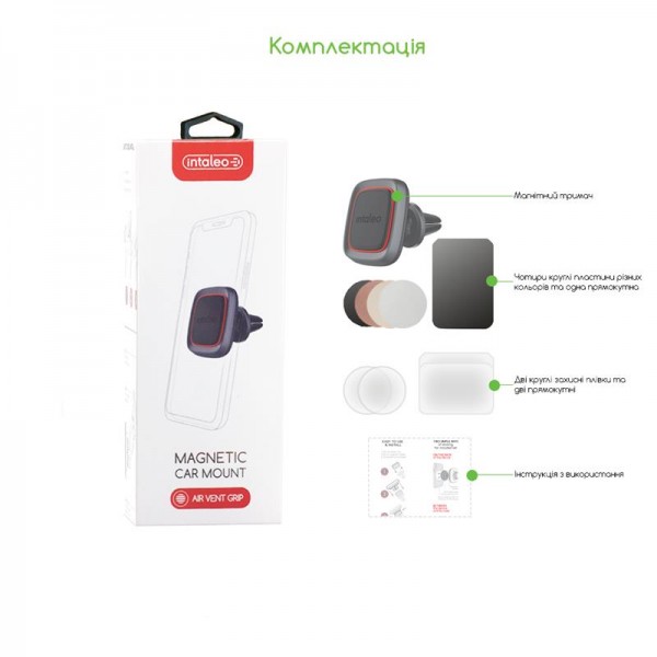 Компактний універсальний автотримач Intaleo CM01GG з вбудованим магнітом зручно й безпечно кріпиться на решітку вентиляції передній панелі авто.