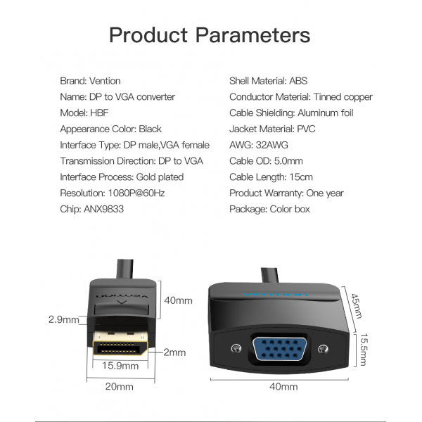 INTERFACE TYPE | DP male, VGA female |