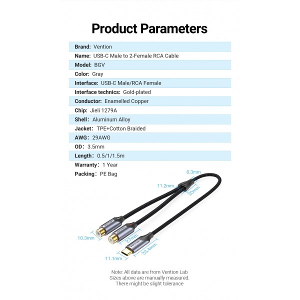 Кабель Audio Vention Type-C-2RCA который может быть использован для передачи аудио сигнала.