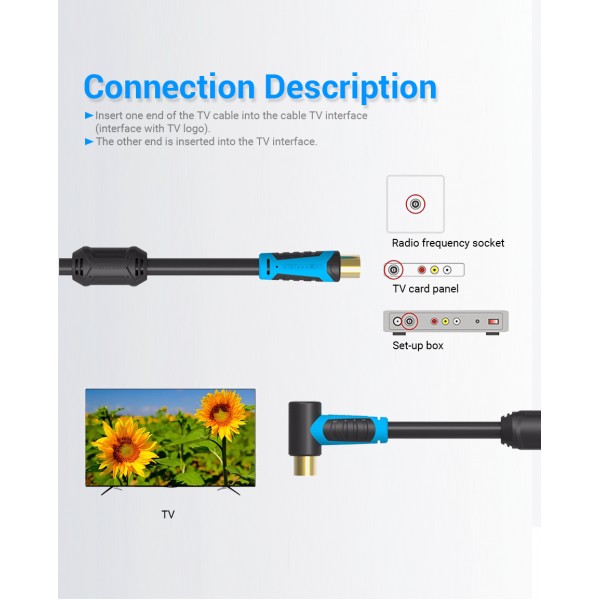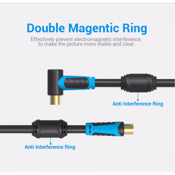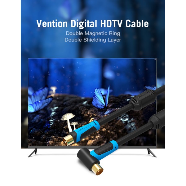 Кабель антенный Vention TV 90° Male - Male предназначен для передачи аналоговых высокочастотных телевизионных сигналов, а также коммутации теле-видео устройств по средствам коаксиального разъема.