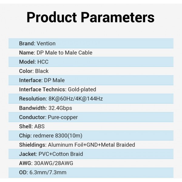 Кабель DisplayPort-DisplayPort v1.4 Vention PVC Shell 8K 60Hz 4K 144Hz 2K 165Hz 32.4Gbps.