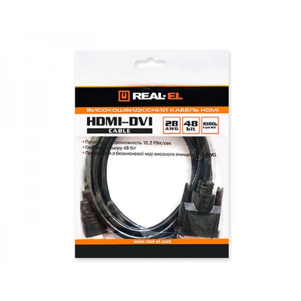 Кабель мультимедійний HDMI to DVI 1.8m REAL-EL (EL123500013) ідеально підійде для підключення Вашого ПК, DVD-плеєра, ноутбука до сучасного монітора або телевізора.