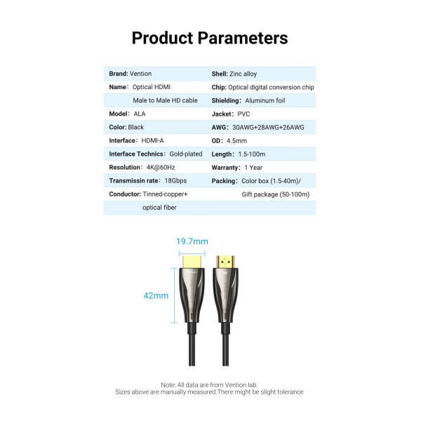 Кабель HDMI-HDMI v.2.0 Vention Optical Zinc PVC 4K 60Hz 18Gbps gold-plated