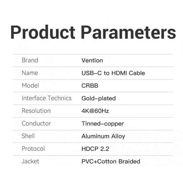 Кабель Type-C-HDMI 2.0 от Vention обеспечивает надежное подключение устройств с разъемом USB Type-C к мониторам, телевизорам или проекторам с разъемом HDMI. Этот кабель поддерживает стандарт HDMI 2.0 и способен передавать видеосигнал с разрешением до 4K при частоте обновления 60 Гц, обеспечивая качественное воспроизведение изображения.