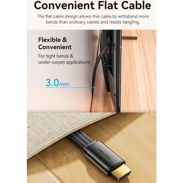 Кабель Vention HDMI-HDMI v2.1 8K 60Hz 4K 144Hz 2K 240Hz QFT 48Gbps Flat Cotton — это премиум-кабель HDMI, который поддерживает самые современные стандарты для передачи видео и аудио с высочайшим качеством. Он идеально подходит для устройств, требующих высокой пропускной способности, таких как 8K телевизоры, игровые консоли нового поколения, ПК и профессиональные мониторы. С максимальной пропускной способностью 48 Гбит/с, этот кабель обеспечивает безупречную передачу изображения и звука.