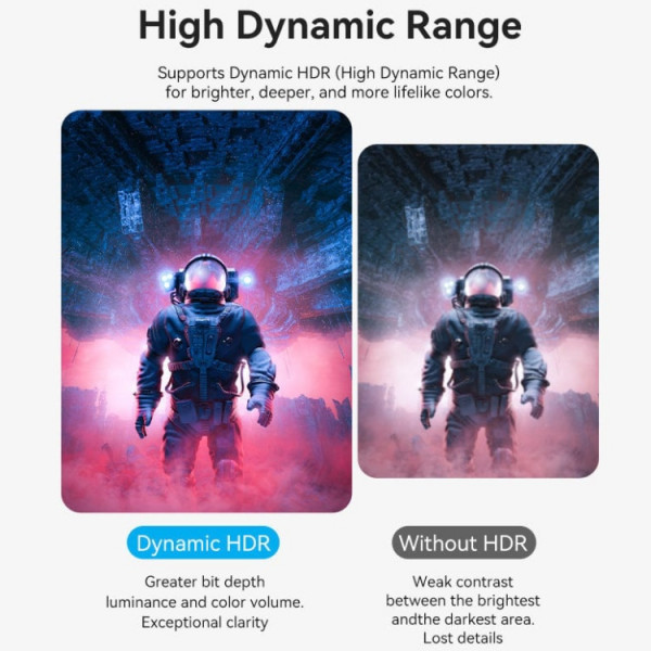 Поддержка HDR: Кабель поддерживает High Dynamic Range (HDR), что улучшает яркость и контрастность изображения, обеспечивая более насыщенные и реалистичные цвета.