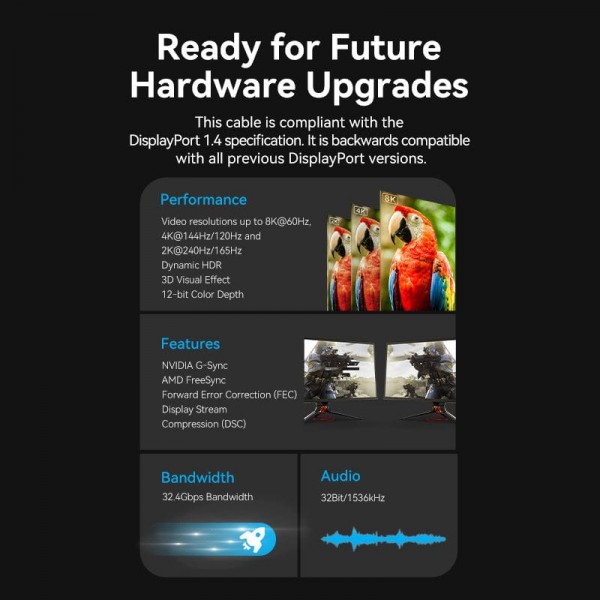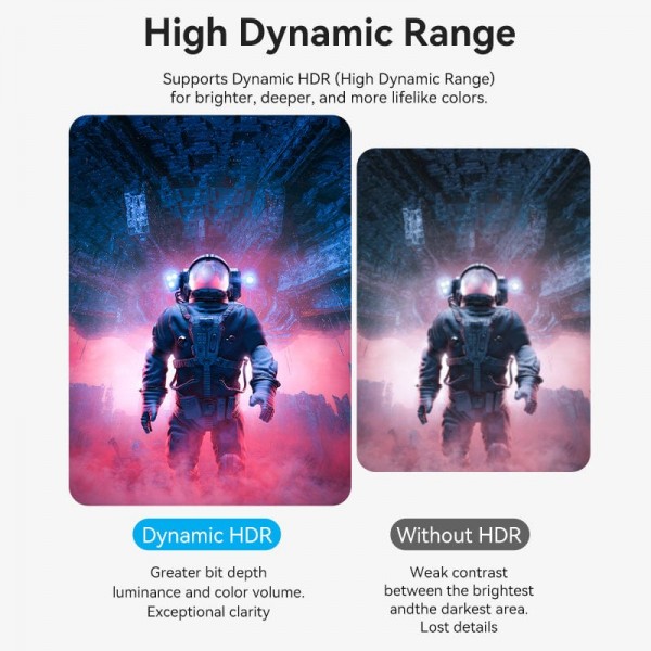 Ідеально підійде для передачі відеоданих у форматі високої роздільної здатності 8K ULTRA HD (7680х4320@60Гц) і має пропускну здатність до 32.4 Гбіт/сек, а також підтримку більш ніж 32 каналів аудіо.