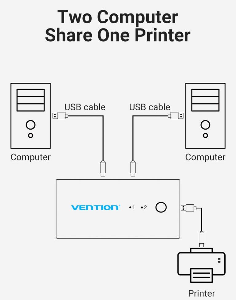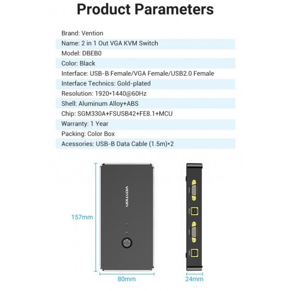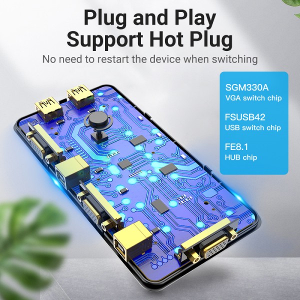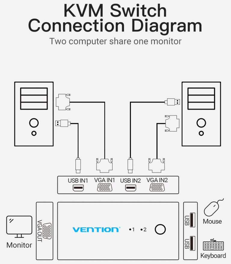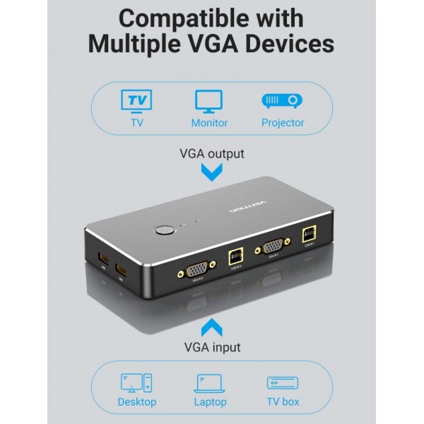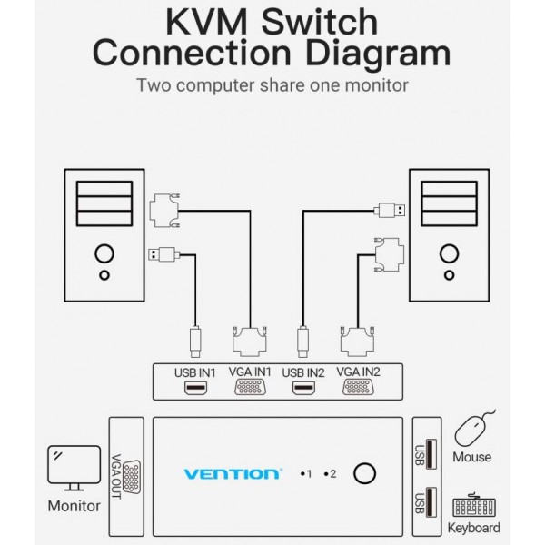 Сплитер KVM 2 in 1 Out VGA-VGA Vention 1080P 60Hz 4USB gold-plated переключатель позволяет управлять двумя компьютерами (игровыми приставками, ТВ боксами), используя только один экран монитора (телевизора) и один набор элементов управления (мышь и клавиатуру).
