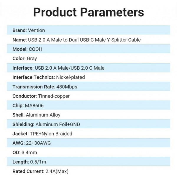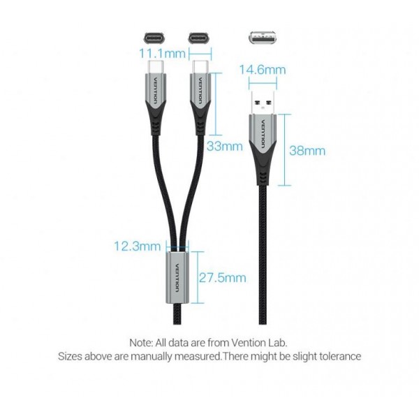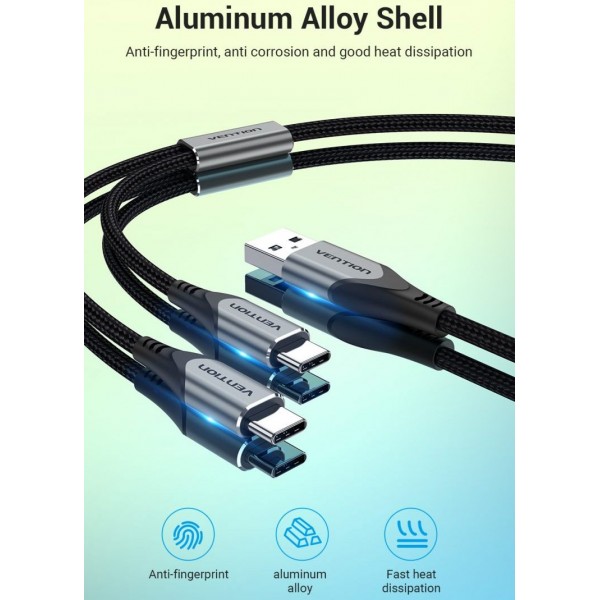 Кабель 2 в 1 USB-Type-C Vention Nylon 2.4А 480Mbps nickel-plated - підтримка одночасної зарядки двох пристроїв з інтерфейсом Type-C.