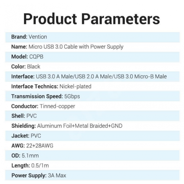 Кабель USB 3.0 на Micro-B – Vention предназначен для подключения / зарядки / переноса данных с периферийных / мобильных устройств на стационарный компьютер либо ноутбук.
