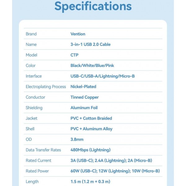 Заряжайте быстро, передавайте данные надежно – с Vention 3 в 1!