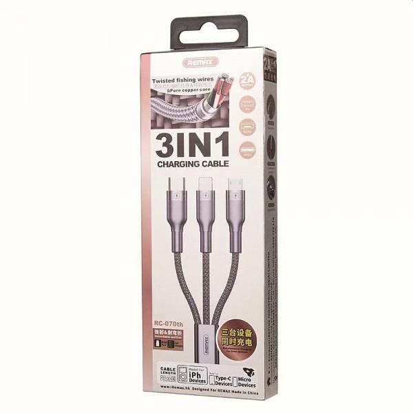 Кабель Remax RC-070th Sury2 - USB-кабель з 3 різними роз’ємами: USB Type C/micro USB/Lightning Один для всіх - ідеальний аксесуар для всіх пристроїв з портом USB-C, micro USB та Lightning.