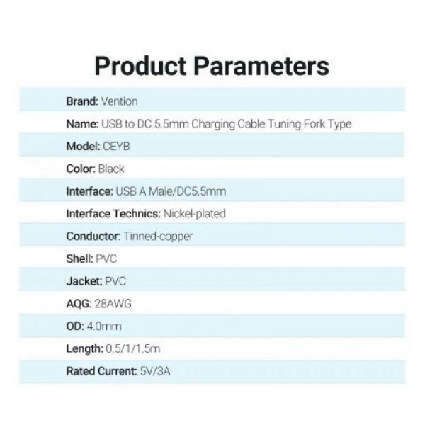 Кабель USB-DC5.5mm Vention 5V 3A – це надійний кабель з роз’ємом, що дозволяє заряджати різні типи пристроїв.