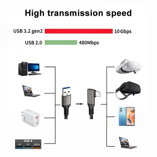 Высокоскоростной кабель Daogu USB Type-C 90° разработан специально для подключения Oculus Quest 2 / Quest 3 / Quest Pro к ПК в режиме Link VR.