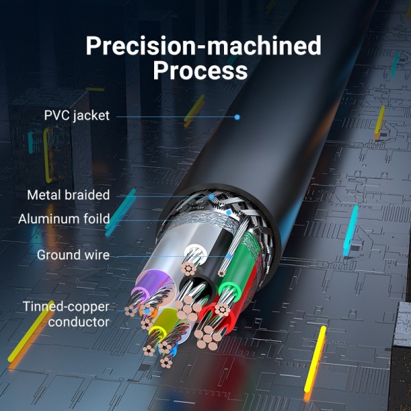 Роз’єми мають корозійно-стійкі луджені мідні провідники, позолочений роз’єм та екранування фольгою та оплеткою, що забезпечує захист від перешкод від сигналів EMI/RFI, що забезпечує високу продуктивність.