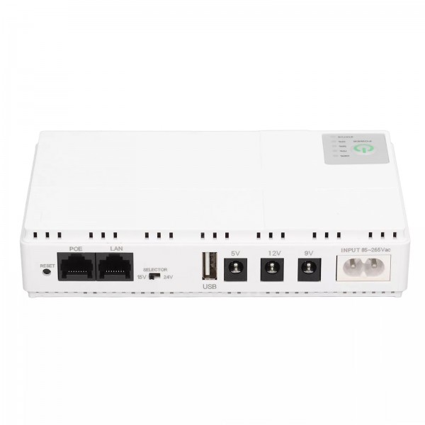 Этот UPS оснащен функцией POE (Power over Ethernet), позволяющей передавать электроэнергию через разъем RJ45 с напряжением 15 В и 24 В. Это особенно удобно для питания устройств, расположенных за пределами помещения, без необходимости прокладывать дополнительные кабели. При подключении через POE скорость передачи данных составляет 100 Мбит/с. Кроме того, этот устройство поддерживает несколько вариантов выходного напряжения и тока: POE: 24V/0.6A, POE: 15V/0.6A, DC: 12V/1A, DC: 9V/1A, DC: 5V/2A, и USB: 5V/2A.