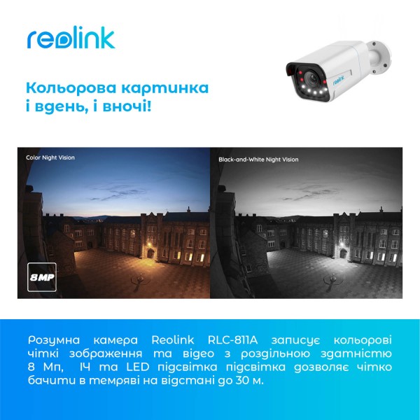 Коли день закінчується, RLC-811A із вбудованими прожекторами продовжує вести запис у повному кольорі. Це дозволяє отримати більше візуальної інформації та деталей, що допомагають розпізнавати людей та автомобілі, ніж у чорно-біле режимі відео.