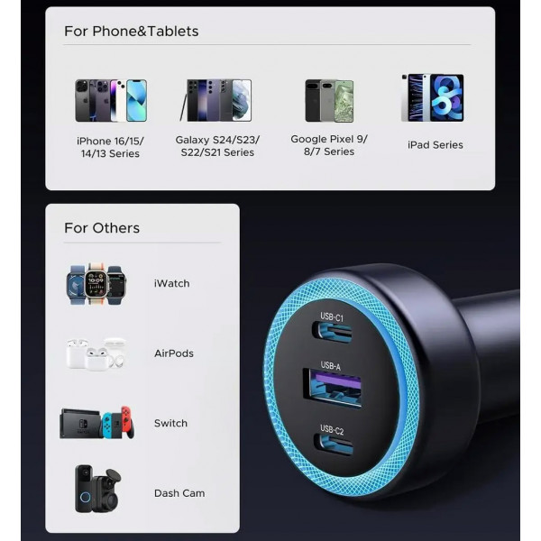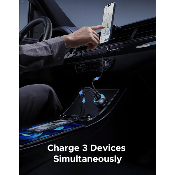 Автозарядка Ugreen EC307 оснащена трьома портами – портом USB-A та двома USB-С. При заряджанні одного пристрою порт USB-A підтримує зарядну потужність до 18 Вт, а порти USB-С – до 30 Вт кожен.