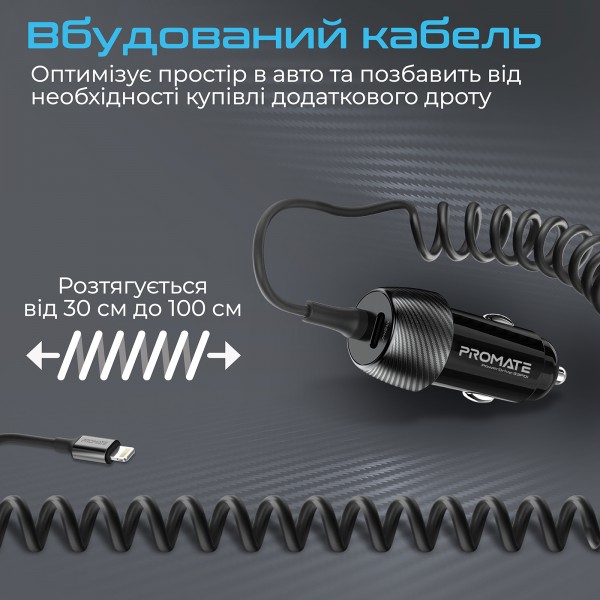 А вбудований спіральний кабель відмінно впорається з технікою Apple, оптимізує простір в авто та позбавить від необхідності купівлі додаткового дроту.