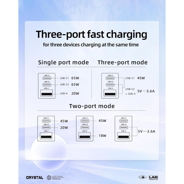 Він оснащений трьома портами – двома USB Type-С з максимальною зарядною потужністю 65 Вт кожен та одним USB Type-A з потужністю до 20 Вт.