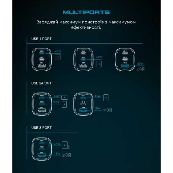 Два порта USB-C поддерживают мощность до 67 Вт, поэтому адаптер можно использовать как для мобильных устройств, так и для ноутбуков. Порт USB-A расширяет возможности адаптера, позволяя питать не только устройства с USB-C, но и технику предыдущих поколений. При одновременном подключении нескольких устройств адаптер распределяет мощность таким образом, чтобы процесс зарядки оставался стабильным.