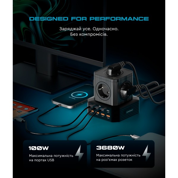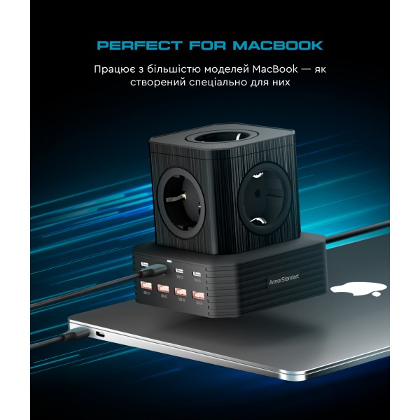 5 розеток позволят одновременно подключить к питанию компьютер, монитор, колонки и роутер, а благодаря USB-выходам с высокой мощностью вы сможете заряжать любые электронные устройства, такие как смартфоны, планшеты, смарт-часы и даже ноутбуки.