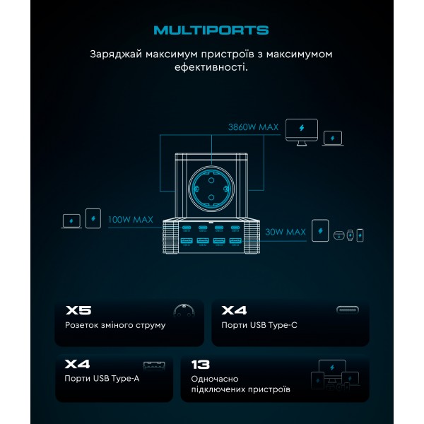 - 4 порта Smart USB и 4 порта USB-C для зарядки гаджетов и ноутбуков.