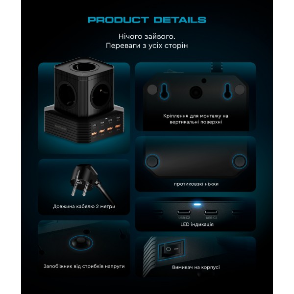 - Дизайн: Уникальный внешний вид с компактным трёхмерным дизайном, который позволяет подключать больше приборов на меньшей площади.