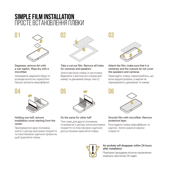 *При установке пленки можно использовать обычную банковскую карту, но важно это делать до снятия транспортировочного слоя пленки, иначе гидрогелевая пленка будет повреждена.