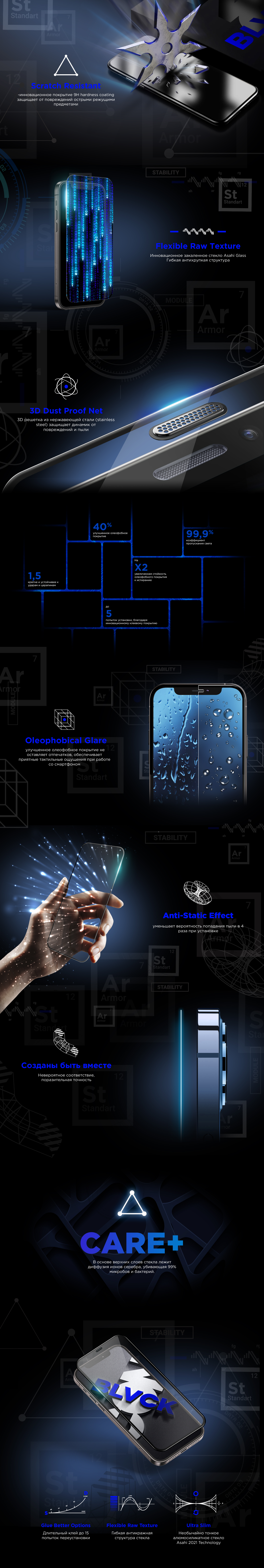Улучшенная клеевая основа позволит произвести установку легко без воздушных пузырей, а также дает возможность повторить установку до 15 раз при необходимости. Anti-static effect уменьшает вероятность попадания мусора в 4 раза при установке.